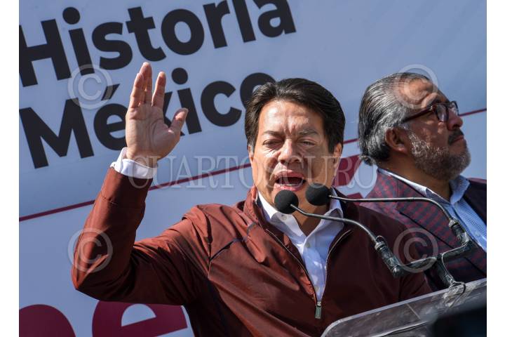 TOLUCA, ESTADO DE MÉXICO, 26MARZO2023.- Delfina Gómez Álvarez dio un mensaje a medios de comunicación y seguidores, estuvo acompañada por Mario Delgado, dirigente nacional de MORENA, Martha Guerrero líder estatal, Higinio Martínez, Karen Castrejón líder nacional de PVEM y Óscar González líder del PT, después de haber solicitado su registro como candidata para la gubernatura del periodo 2023-2029 por la coalición “Juntos Hacemos pa Historia por el Estado de México” conformada por MORENA, PVEM y PT, FOTO: CRISANTA ESPINOSA AGUILAR /CUARTOSCURO.COM
