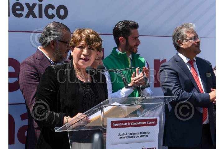 TOLUCA, ESTADO DE MÉXICO, 26MARZO2023.- Delfina Gómez Álvarez dio un mensaje a medios de comunicación y seguidores, estuvo acompañada por Mario Delgado, dirigente nacional de MORENA, Martha Guerrero líder estatal, Higinio Martínez, Karen Castrejón líder nacional de PVEM y Óscar González líder del PT, después de haber solicitado su registro como candidata para la gubernatura del periodo 2023-2029 por la coalición “Juntos Hacemos pa Historia por el Estado de México” conformada por MORENA, PVEM y PT, FOTO: CRISANTA ESPINOSA AGUILAR /CUARTOSCURO.COM