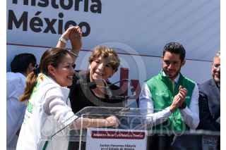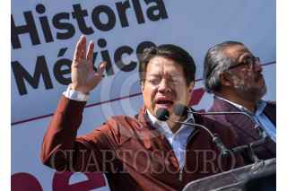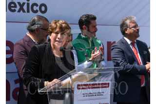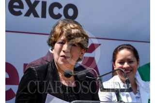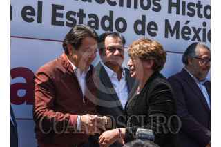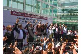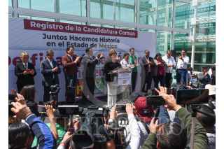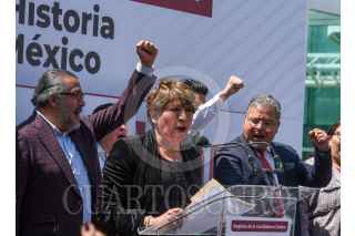 TOLUCA, ESTADO DE MÉXICO, 26MARZO2023.- Delfina Gómez Álvarez dio un mensaje a medios de comunicación y seguidores, estuvo acompañada por Mario Delgado, dirigente nacional de MORENA, Martha Guerrero líder estatal, Higinio Martínez, Karen Castrejón líder nacional de PVEM y Óscar González líder del PT, después de haber solicitado su registro como candidata para la gubernatura del periodo 2023-2029 por la coalición “Juntos Hacemos pa Historia por el Estado de México” conformada por MORENA, PVEM y PT, FOTO: CRISANTA ESPINOSA AGUILAR /CUARTOSCURO.COM