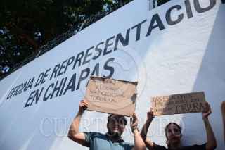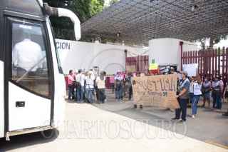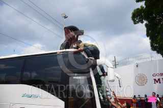 TAPACHULA, CHIAPAS, 29MARZO2023.- Organizaciones civiles protestaron afuera de la estación migratoria siglo XXI en tapachula, gritaban consignas " libertad a los migrantes" con pancartas en manos se acoloraron en la entrada de éste resinto,, minutos después, llegó un autobús de INM, proveniente de veracruz, trasladaba unas 30 personas de la población flotante, un grupo de 8 migrantes salieron por la escotilla y se fugaron. FOTO: DAMIÁN SÁNCHEZ/CUARTOSCURO.COM