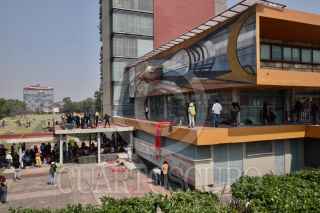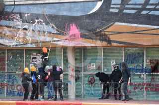 CIUDAD DE MÉXICO, 31MARZO2023.- Algunos integrantes encapuchados que participaron durante la manifestación del contingente de estudiantes de la Facultad de Artes y Diseño (FAD) que marcharon por Ciudad Universitaria vandalizaron el mural de David Alfaro Siqueiros, ubicado en la Torre de la Rectoría. FOTO: CUARTOSCURO.COM