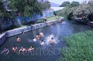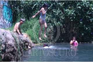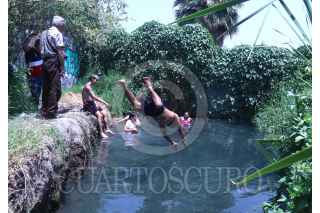 YAUTEPEC, MORELOS, 02ABRIL2023.- Temperaturas de más de 35 grados se registran en la entidad lo que lleva a decenas de personas a buscar algún manantial donde refrescarse. En la imagen vecinos de Yautepec se bañan en las compuertas del manantial del Repartidor. FOTO: MARGARITO PÉREZ RETANA / CUARTOSCURO.COM