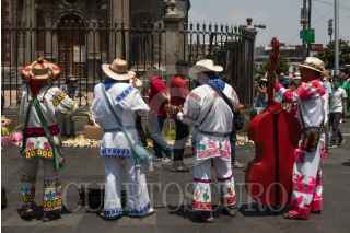 CIUDAD DE MÉXICO, 02ABRIL2023.- Banda musical de huicholes amenizan con "La del moño colorado" el andar de los paseantes en la Catedral Metropolitana. FOTO: MOISÉS PABLO/CUARTOSCURO.COM