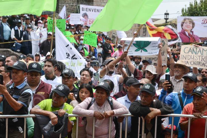OCOYOACAC, ESTADO DE MÉXICO, 04ABRIL2023.- Delfina Gómez, candidata a la gubernatura del Estado de México, por la coalición “Juntos Hacemos Historia en el Estado de México” durante su segundo día de campaña en la plaza Insurgentes en Ocoyoacac. FOTO: MARIO JASSO/CUARTOSCURO.COM
