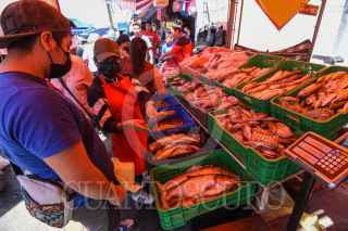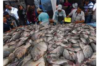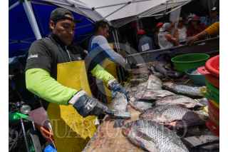 ZINACANTEPEC, ESTADO DE MÉXICO, 05ABRIL2023.- Venta de pescado en San Luis Mextepec en el municipio de Zinacantepec, desde muy temprana hora la gente llega a buscar este producto que se vende en esta delegación para comer durante los días santos, este año el precio del pescado no subió en comparación con el año pasado, en algunos casos bajó hasta 30 o 40 pesos, ayudando a la economía familiar. FOTO: CRISANTA ESPINOSA AGUILAR /CUARTOSCURO.COM