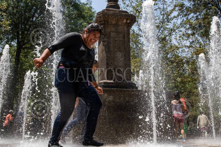 CIUDAD DE MÉXICO, 06ABRIL2023.- Intenso calor se vive en la capital, muchos ciudadanos buscan mitigar los rayos como pueden, algunos se refugian debajo de las jacarandas, otros se tapan con sus chamarras, y los más pequeños se dan un chapuzón en las fuentes de la Alameda Central. FOTO: MOISÉS PABLO/CUARTOSCURO.COM