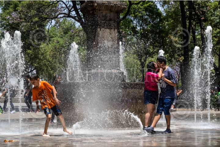 CIUDAD DE MÉXICO, 06ABRIL2023.- Intenso calor se vive en la capital, muchos ciudadanos buscan mitigar los rayos como pueden, algunos se refugian debajo de las jacarandas, otros se tapan con sus chamarras, y los más pequeños se dan un chapuzón en las fuentes de la Alameda Central. FOTO: MOISÉS PABLO/CUARTOSCURO.COM