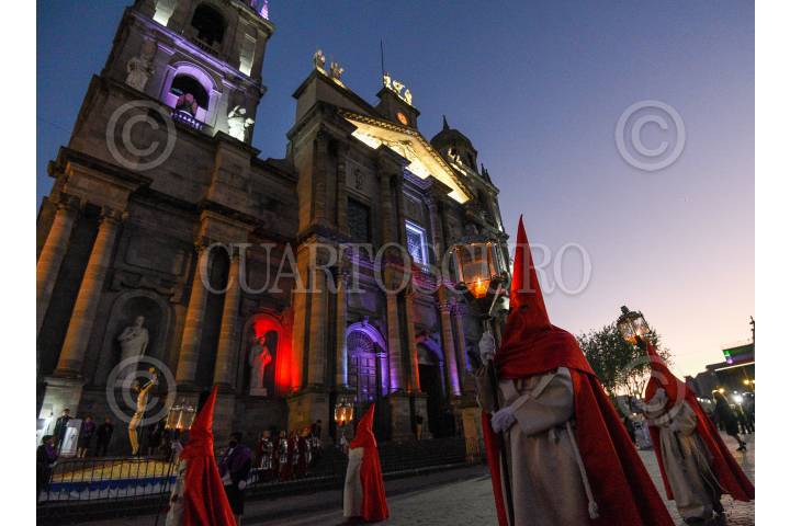 TOLUCA, ESTADO DE MÉXICO, 07ABRIL2023.- Al caer la tarde de este Viernes Santo dio inicio la Procesión del Silencio en Toluca en su edición número 45 las cofradías participantes desfilaron por las calles de Toluca cargando las imágenes que representan las 14 estaciones del Viacrucis que pudieron disfrutar los asistentes a este recorrido. FITO: CRISANTA ESPINOSA AGUILAR /CUARTOSCURO.COM