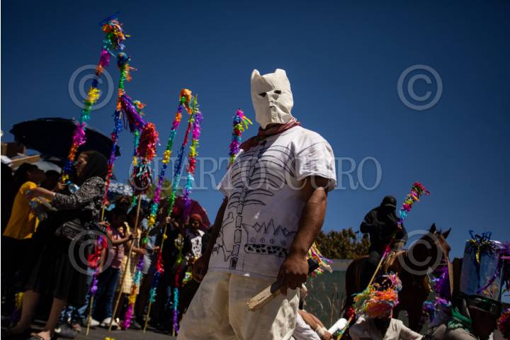 JIMÉNEZ DEL TEÚL, ZACATECAS, 09ABRIL2023.- A trescientos kilómetros de la capital Zacatecana, en este municipio se realiza cada año, desde su fundación en 1591; durante la Semana Santa, la enigmática y colorida “Judea”, en la este año, alrededor de entre 60 y 80 participantes representa de manera teatral-ancestral la pasión de Cristo.Con pocos cambios desde su origen, uno de los pasajes más significativos del catolicismo, se entrelaza con las tradiciones de los pueblos originarios de la región de lo que hoy es Zacatecas, Durango, Nayarit y Jalisco; muestra la interpretación que estos pueblos tuvieron del acto litúrgico al momento de la conquista espiritual. El Viernes Santo es el día más representativo. Los participantes, desde temprana hora inicia con la persecución delos “barrabases”, personajes que representan a Dimas, Gestas y Barrabás, los ladrones que fueron crucificados junto a Jesús. Durante todo el tiempo la procesión es acompañada por los sonidos característico de una tambora y un cuerno. Todo el pueblo se reúne para caminar detrás de los participantes una vez más desde la capilla de la Guadalupana hasta el templo principal; en el trayecto se van deteniendo en los altares colocados afuera de casas para rememorar la Pasión de Cristo. Se presentan personajes relacionados con el sufrimiento de Jesucristo, como las mujeres piadosas, las verónicas, los jueces, las muertes o los centuriones, cada uno con un atuendo y características distintivas, que van recreando, en silencio, solo con la compañía del tambor y el sonido del cuerno. La celebración termina con la crucifixión de Jesús, una imagen que es cargada por pobladores y su sepultura. Esta tradición de uno de los pueblos más alejados de la capital es promovida y organizada por un comité organizativo de la comunidad, pero el profe Ponciano Guevara, quien además es cronista del municipio, mantiene el impulso para seguir manteniendo esta original e histórica tradición. FOTO: ADOLFO VLADIMIR /CUARTOSCURO.COM
