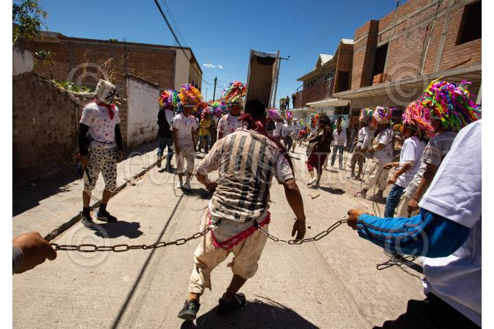 JIMÉNEZ DEL TEÚL, ZACATECAS, 09ABRIL2023.- A trescientos kilómetros de la capital Zacatecana, en este municipio se realiza cada año, desde su fundación en 1591; durante la Semana Santa, la enigmática y colorida “Judea”, en la este año, alrededor de entre 60 y 80 participantes representa de manera teatral-ancestral la pasión de Cristo.Con pocos cambios desde su origen, uno de los pasajes más significativos del catolicismo, se entrelaza con las tradiciones de los pueblos originarios de la región de lo que hoy es Zacatecas, Durango, Nayarit y Jalisco; muestra la interpretación que estos pueblos tuvieron del acto litúrgico al momento de la conquista espiritual. El Viernes Santo es el día más representativo. Los participantes, desde temprana hora inicia con la persecución delos “barrabases”, personajes que representan a Dimas, Gestas y Barrabás, los ladrones que fueron crucificados junto a Jesús. Durante todo el tiempo la procesión es acompañada por los sonidos característico de una tambora y un cuerno. Todo el pueblo se reúne para caminar detrás de los participantes una vez más desde la capilla de la Guadalupana hasta el templo principal; en el trayecto se van deteniendo en los altares colocados afuera de casas para rememorar la Pasión de Cristo. Se presentan personajes relacionados con el sufrimiento de Jesucristo, como las mujeres piadosas, las verónicas, los jueces, las muertes o los centuriones, cada uno con un atuendo y características distintivas, que van recreando, en silencio, solo con la compañía del tambor y el sonido del cuerno. La celebración termina con la crucifixión de Jesús, una imagen que es cargada por pobladores y su sepultura. Esta tradición de uno de los pueblos más alejados de la capital es promovida y organizada por un comité organizativo de la comunidad, pero el profe Ponciano Guevara, quien además es cronista del municipio, mantiene el impulso para seguir manteniendo esta original e histórica tradición. FOTO: ADOLFO VLADIMIR /CUARTOSCURO.COM