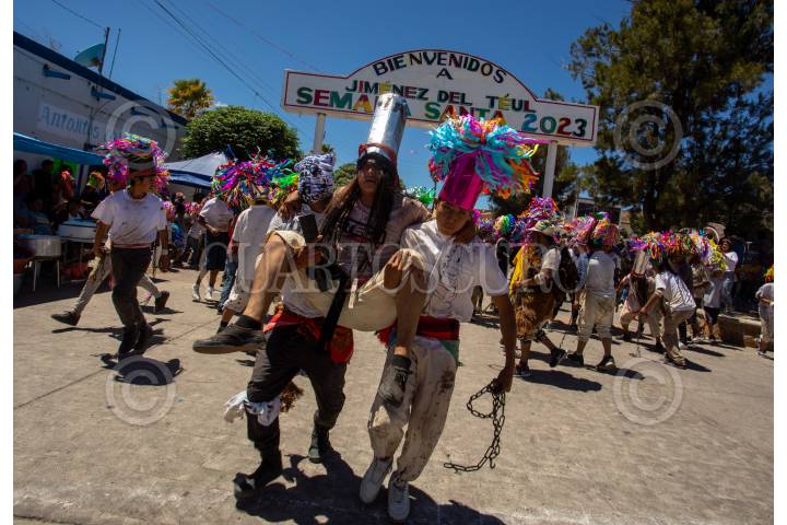 JIMÉNEZ DEL TEÚL, ZACATECAS, 09ABRIL2023.- A trescientos kilómetros de la capital Zacatecana, en este municipio se realiza cada año, desde su fundación en 1591; durante la Semana Santa, la enigmática y colorida “Judea”, en la este año, alrededor de entre 60 y 80 participantes representa de manera teatral-ancestral la pasión de Cristo.Con pocos cambios desde su origen, uno de los pasajes más significativos del catolicismo, se entrelaza con las tradiciones de los pueblos originarios de la región de lo que hoy es Zacatecas, Durango, Nayarit y Jalisco; muestra la interpretación que estos pueblos tuvieron del acto litúrgico al momento de la conquista espiritual. El Viernes Santo es el día más representativo. Los participantes, desde temprana hora inicia con la persecución delos “barrabases”, personajes que representan a Dimas, Gestas y Barrabás, los ladrones que fueron crucificados junto a Jesús. Durante todo el tiempo la procesión es acompañada por los sonidos característico de una tambora y un cuerno. Todo el pueblo se reúne para caminar detrás de los participantes una vez más desde la capilla de la Guadalupana hasta el templo principal; en el trayecto se van deteniendo en los altares colocados afuera de casas para rememorar la Pasión de Cristo. Se presentan personajes relacionados con el sufrimiento de Jesucristo, como las mujeres piadosas, las verónicas, los jueces, las muertes o los centuriones, cada uno con un atuendo y características distintivas, que van recreando, en silencio, solo con la compañía del tambor y el sonido del cuerno. La celebración termina con la crucifixión de Jesús, una imagen que es cargada por pobladores y su sepultura. Esta tradición de uno de los pueblos más alejados de la capital es promovida y organizada por un comité organizativo de la comunidad, pero el profe Ponciano Guevara, quien además es cronista del municipio, mantiene el impulso para seguir manteniendo esta original e histórica tradición. FOTO: ADOLFO VLADIMIR /CUARTOSCURO.COM