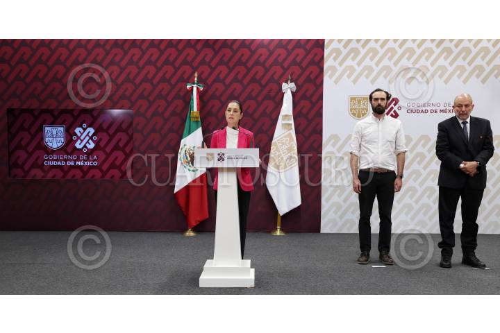 CIUDAD DE MÉXICO, 10ABRIL2023.- Claudia Sheinbaum, Jefa de Gobierno, ofreció su conferencia acompañada de Andrés Lajous, secretario de Movilidad, y Guillermo Calderón, director del Metro. La morenita señaló que la Guardia Nacional solo vigilará el metro por las noches y un concierto gratuito de la cantante Rosalía el 29 de abril en el Zócalo. FOTO: GOBIERNO DE LA CIUDAD DE MÉXICO/CUARTOSCURO.COM