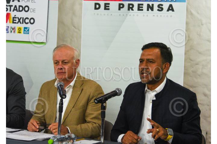 TOLUCA, ESTADO DE MÉXICO, 12ABRIL2023.- Los líderes del PRI, PAN, PRD y Nueva Alianza en el Estado de México Erick Sevilla Montea de Oca, Anuar Azar, Agustín Barrera y Mario Alberto Cervantes, integrantes de la Coalición “Va por el Estado de México” en conferencia de prensa exigieron a la candidata de MORENA Delfina Gómez respete el acuerdo y acuda al primer debate programado para el 20 de abril, después de que pidieran un aplazamiento. FOTO: CRISANTA ESPINOSA AGUILAR /CUARTOSCURO.COM