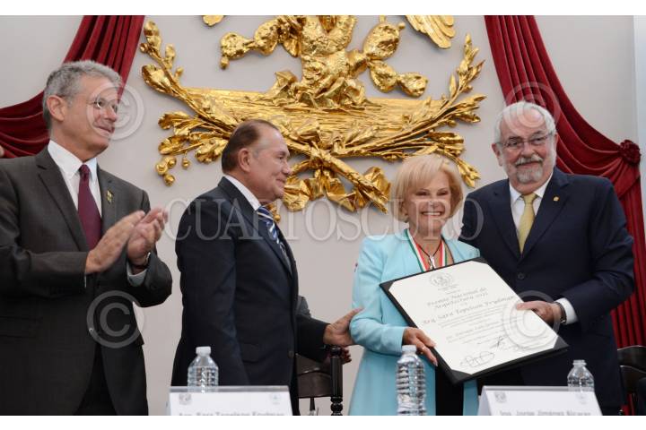 CIUDAD DE MÉXICO, 12ABRIL2023.- El rector de la UNAM, Enrique Graue Wiechers, entregó los premios nacionales de Ingeniería y Arquitectura 2021, que otorga la Asociación de Ingenieros y Arquitectos de México (AIAM), al doctor Luis Esteva Maraboto y a la arquitecta Sara Topelson Frydman, respectivamente. En la ceremonia, en la cual reiteró que defenderá la autonomía universitaria y sus fortalezas ante todo, el rector destacó que esos galardones cuentan con una larga historia en México. “Hoy celebramos los valores que la arquitecta Topelson y el doctor Esteva han antepuesto para el bien común de la nación. Su actuar y trayectoria son vivo ejemplo para los profesionistas del presente y para las nuevas generaciones”. FOTO: UNAM/CUARTOSCURO..COM