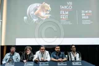 CIUDAD DE MÉXICO, 13ABRIL2023.- Rafael Martínez García, director; Danae Reynaud, actriz, guionista y directora franco-mexicana; Naú Aguilera, director del Festival Internacional de Cine de Taxco; José Uriel, programador del (FICT), y Juan Briseño, director de la película Corazón de Plata, encabezaron la conferencia y presentación del VIII Festival Internacional de Cine de Taxco para el próximo 21-29 de abril del presente año. El anuncio se realizó en las inmediaciones de los Estudios Churubusco. FOTO: GALO CAÑAS/CUARTOSCURO.COM