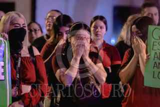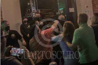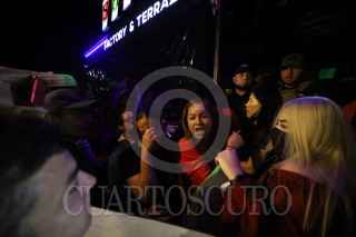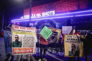 MEXICALI BAJA CALIFORNIA, 16ABRILMARZO2023.- Ante la creciente cantidad de secuestros en el llamado 'triángulo de las bermudas', familias afectadas y comunidad se manifiestan en el Bar SHOTS de Mexicali, en donde el pasado 8 de abril desaparecieron 3 hombres. Son 9 las personas que han sido víctimas de secuestro desde el 2022 hasta ahora. Los manifestantes entraron a las instalaciones del bar, rompiendo el límite perimetral; los agentes de la fiscalía impidieron el acceso. El mismo movimiento se dirigió al bar aledaño, en donde lograron hacer que cierre dicho bar. Mientras las personas salían, les gritaban: "!Felicidades, salieron con vida!". Más tarde, tras no ver actualización y tener información, el contigente se movilizó a la parte posterior del bar, en donde rompieron una parte de la fachada del bar y accesaron a cuartos que, de acuerdo a palabras de los fiscales, ya se habían revisado, sin embargo, en estos mismos cuartos se encontró un arma, altares con billetes y balas. FOTO: JACK ÁLVAREZ / CUARTOSCURO.COM