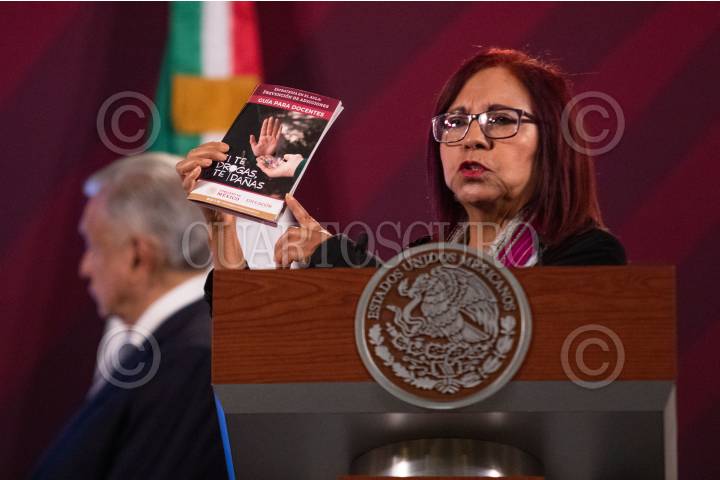 CIUDAD DE MÉXICO, 17ABRIL2023.- Andrés Manuel López Obrador, Presidente de México, durante la mañanera en la cual se habló de los avances del Tren Maya Tramo 1, en Palacio Nacional. Lo acompañaron Rutilio Escandón Cadenas, gobernador del estado de Chiapas; Carlos Manuel Merino Campos, gobernador del estado de Tabasco; María Luisa Albores Gonzales, secretaria de Medio Ambiente y Recursos Naturales (SEMARNAT); Ariadna Montiel Reyes, secretaria de Bienestar; Leticia Ramírez Amaya, secretaria de Educación Pública; Javier May Rodríguez, director general de FONATUR; Hugo López Gatell Ramírez, subsecretario de Prevención y Promoción de la Salud; Ricardo Sheffield Padilla, Procurador Federal del Consumidor; Diego Prieto Hernández, director general del INAH; Maité Ramos Gómez, directora general de ALSTOM México; Joao Pedro Santos Parreira, presidente de Mota Engil Latinoamérica, y Blas Andrés Núñez Jordan, jefe del centro coordinador Tren Maya de la dirección General de Ingenieros FOTO: MOISÉS PABLO/CUARTOSCURO.COM