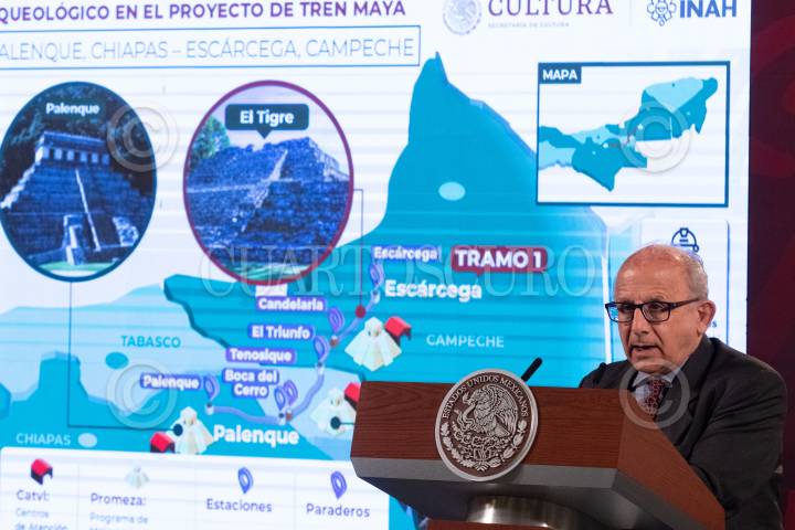 CIUDAD DE MÉXICO, 17ABRIL2023.- Andrés Manuel López Obrador, Presidente de México, durante la mañanera en la cual se habló de los avances del Tren Maya Tramo 1, en Palacio Nacional. Lo acompañaron Rutilio Escandón Cadenas, gobernador del estado de Chiapas; Carlos Manuel Merino Campos, gobernador del estado de Tabasco; María Luisa Albores Gonzales, secretaria de Medio Ambiente y Recursos Naturales (SEMARNAT); Ariadna Montiel Reyes, secretaria de Bienestar; Leticia Ramírez Amaya, secretaria de Educación Pública; Javier May Rodríguez, director general de FONATUR; Hugo López Gatell Ramírez, subsecretario de Prevención y Promoción de la Salud; Ricardo Sheffield Padilla, Procurador Federal del Consumidor; Diego Prieto Hernández, director general del INAH; Maité Ramos Gómez, directora general de ALSTOM México; Joao Pedro Santos Parreira, presidente de Mota Engil Latinoamérica, y Blas Andrés Núñez Jordan, jefe del centro coordinador Tren Maya de la dirección General de Ingenieros FOTO: MOISÉS PABLO/CUARTOSCURO.COM
