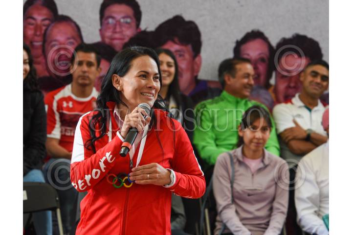 SAN MATEO ATENCO, ESTADO DE MÉXICO, 17ABRIL2023.- Alejandra del Moral Vela candidata a la gubernatura del Edoméx por la Coalición “Va por el Estado de México” sostuvo un encuentro con deportistas en la Ciudad Deportiva de San Mateo Atenco en donde expuso cómo impulsará el deporte en el Edoméx, estuvo acompañada por deportistas mexiquense como el boxeador Carlos Cuadras, la ex clavadista Tatiana Ortiz, FOTO: CRISANTA ESPINOSA AGUILAR/CUARTOSCURO.COM