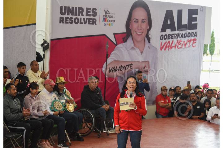 SAN MATEO ATENCO, ESTADO DE MÉXICO, 17ABRIL2023.- Alejandra del Moral Vela candidata a la gubernatura del Edoméx por la Coalición “Va por el Estado de México” sostuvo un encuentro con deportistas en la Ciudad Deportiva de San Mateo Atenco en donde expuso cómo impulsará el deporte en el Edoméx, estuvo acompañada por deportistas mexiquense como el boxeador Carlos Cuadras, la ex clavadista Tatiana Ortiz, FOTO: CRISANTA ESPINOSA AGUILAR/CUARTOSCURO.COM