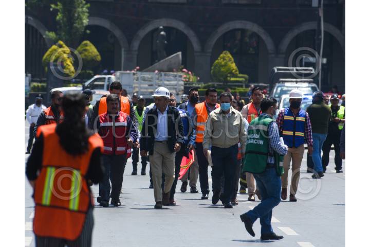 TOLUCA, ESTADO DE MÉXICO, 19ABRIL2023.- Trabajadores de Palacio de Gobierno, Cámara de Diputados Local, Poder Judicial y el Ayuntamiento de Toluca participaron en el Primer Simulacro Nacional 2023, a las 11:00 hrs se activó la alerta sísmica, con una hipótesis de sismo magnitud 7.5 localizado en los límites de Puebla y Veracruz, las brigadas de Protección Civil realizaron la inspección de los inmuebles. Luis Felipe Puente Secretario General de Gobierno dio los pormenores de este ejercicio. FOTO: CRISANTA ESPINOSA AGUILAR /CUARTOSCURO.COM