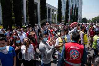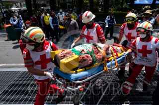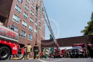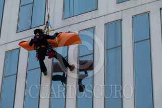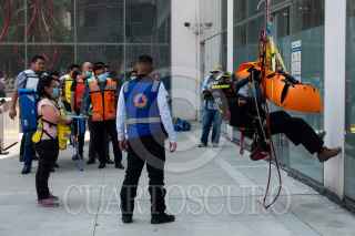 CIUDAD DE MÉXICO, 19ABRIL2023.- Cientos de personas que laboran en los juzgados y edificios aledaños a la zona conocida como “Ciudad Judicial” en la alcaldía Cuauhtémoc participaron en el macro simulacro de sismo. Dentro de los ejercicios, elementos de bomberos realizaron el rescate de personas atrapadas por un conato de incendio en la azotea y en pisos elevados de una de las edificaciones, así como el descenso vía rapel de una persona lesionada. FOTO: GALO CAÑAS/CUARTOSCURO.COM
