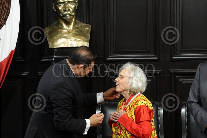 CIUDAD DE MÉXICO, 19ABRIL2023.- La escritora Elena Poniatowska recibió la medalla Belisario Domínguez por Adán Augusto, secretario de Gobernación, en el Senado de la República, sede Xicoténcatl. FOTO: GRACIELA LÓPEZ /CUARTOSCURO.COM
