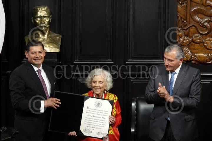 CIUDAD DE MÉXICO, 19ABRIL2023.- La escritora Elena Poniatowska recibió la medalla Belisario Domínguez por Adán Augusto, secretario de Gobernación, en el Senado de la República, sede Xicoténcatl. FOTO: GRACIELA LÓPEZ /CUARTOSCURO.COM