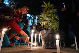 CIUDAD DE MÉXICO, 20ABRIL2023.- Integrantes de la comunidad cannabica en la capital del país se manifestaron en la Glorieta de Insurgentes con la llamada “Cannabis Luminosa”, ofrenda en que se colocaron velas y una planta de cannabis al centro para conmemorar el día mundial por la despenalización y legalización del consumo de dicha planta. Las y los asistentes prendieron algunos cigarros y escucharon reggae, invitando a la gente a sumarse y a las autoridades a dejar de perseguirlos. FOTO: GALO CAÑAS/CUARTOSCURO.COM