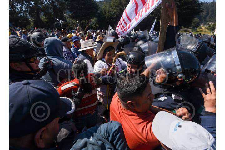 OCOYOACAC, ESTADO DE MÉXICO, 20ABRIL2023.- Ejidatarios de San Jerónimo Acazulco y San Lorenzo Acopilco bloquearon la carretera Toluca-México en ambos sentidos en defensa de su territorio exigiendo el cumplimento de las obras de la SCT, entre ellos proyectos de desarrollo para su comunidad que les prometieron desde hace 8 años con las obras del tren interurbano; granaderos de la secretaría de seguridad arribaron al lugar para retirarlos, y dejar al menos el paso libre por un carril, por momentos se hicieron de empujones y volaron piedras y palos, los ejidatarios quemaron llantas, palos y pasto para evitar el paso, mientras se realizaba la mesa de diálogo. FOTO: : CRISANTA ESPINOSA AGUILAR /CUARTOSCURO.COM