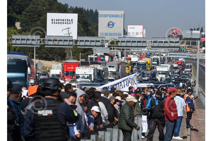 OCOYOACAC, ESTADO DE MÉXICO, 20ABRIL2023.- Ejidatarios de San Jerónimo Acazulco y San Lorenzo Acopilco bloquearon la carretera Toluca-México en ambos sentidos en defensa de su territorio exigiendo el cumplimento de las obras de la SCT, entre ellos proyectos de desarrollo para su comunidad que les prometieron desde hace 8 años con las obras del tren interurbano; granaderos de la secretaría de seguridad arribaron al lugar para retirarlos, y dejar al menos el paso libre por un carril, por momentos se hicieron de empujones y volaron piedras y palos, los ejidatarios quemaron llantas, palos y pasto para evitar el paso, mientras se realizaba la mesa de diálogo. FOTO: : CRISANTA ESPINOSA AGUILAR /CUARTOSCURO.COM