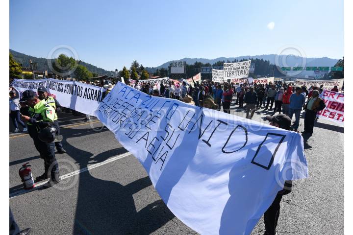 OCOYOACAC, ESTADO DE MÉXICO, 20ABRIL2023.- Ejidatarios de San Jerónimo Acazulco y San Lorenzo Acopilco bloquearon la carretera Toluca-México en ambos sentidos en defensa de su territorio exigiendo el cumplimento de las obras de la SCT, entre ellos proyectos de desarrollo para su comunidad que les prometieron desde hace 8 años con las obras del tren interurbano; granaderos de la secretaría de seguridad arribaron al lugar para retirarlos, y dejar al menos el paso libre por un carril, por momentos se hicieron de empujones y volaron piedras y palos, los ejidatarios quemaron llantas, palos y pasto para evitar el paso, mientras se realizaba la mesa de diálogo. FOTO: : CRISANTA ESPINOSA AGUILAR /CUARTOSCURO.COM