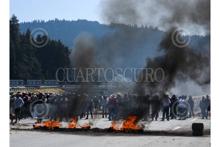 OCOYOACAC, ESTADO DE MÉXICO, 20ABRIL2023.- Ejidatarios de San Jerónimo Acazulco y San Lorenzo Acopilco bloquearon la carretera Toluca-México en ambos sentidos en defensa de su territorio exigiendo el cumplimento de las obras de la SCT, entre ellos proyectos de desarrollo para su comunidad que les prometieron desde hace 8 años con las obras del tren interurbano; granaderos de la secretaría de seguridad arribaron al lugar para retirarlos, y dejar al menos el paso libre por un carril, por momentos se hicieron de empujones y volaron piedras y palos, los ejidatarios quemaron llantas, palos y pasto para evitar el paso, mientras se realizaba la mesa de diálogo. FOTO: : CRISANTA ESPINOSA AGUILAR /CUARTOSCURO.COM