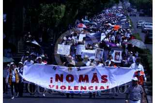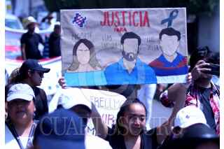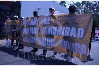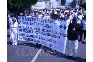 CUERNAVACA, MORELOS, 20ABRIL2003.- Cientos de trabajadores, estudiantes e investigadores del Instituto Nacional de Salud PÚBLICA (INSP) acompañados de víctimas de la violencia y familiares y amigos de los hermanos Luis Enrique y Luis Javier García Díaz y Noemi Guadalupe Arias Sosa, marcharon desde las instalaciones del INSP hasta el zocalo de la ciudad en demanda de seguridad pública. Los hermanos Garcia Díaz y Noemi Guadalupe, pareja sentimental de Luis Enrique (quienes trabajaban en el INSP,) desaparecieron la tarde del miércoles 12 de abril cuando regresaban de una cita en una óptica en la ciudad de México,. Los cadáveres de los tres fueron localizados en un paraje Huitzilac, (con señales de brutalidad como es la violacion de la mujer y la cercenacion de sus senos) el viernes pasado. La exigencia de justicia fue la demanda principal de la movilización, así como la reprobación del gobierno del ex futbolista Cuauhtémoc Blanco, al cual calificaron de "gobernador ausente e indolente. FOTO: MARGARITO PÉREZ RETANA / CUARTOSCURO.COM