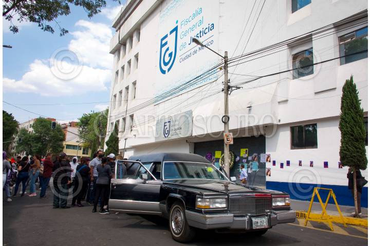 CIUDAD DE MÉXICO, 20ABRIL2023.- Familiares de Perla Cristal, la joven de Ciudad de México que fue encontrada en Guanajuato, llevaron el cuerpo de la joven a las instalaciones de la Fiscalía General de Justicia de la Ciudad de México (FGJCDMX), dónde realizaron una protesta para exigir justicia. El cuerpo de la joven de 19 años fue hablado en la entidad el día de ayer, 11 días después de su desaparición. El féretro fue custodiado por un grupo de jóvenes, quienes exigieron se esclarezca su feminicidio, la entrada de la dependencia fue tapizada con fotos de la chica. FOTO: ROGELIO MORALES/CUARTOSCURO.COM