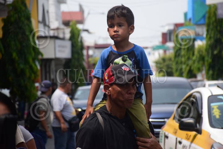TAPACHULA, CHIAPAS, 20ABRIL2023.- Migrantes marcharon del Parque Bicentenario rumbo al Parque de las Etnias, para exigir castigo a funcionarios del Instituto Nacional de Migración (INM) involucrados en la muerte de 40 migrantes en un estación migratoria en Ciudad Juárez. Los inconformes llevaron piñatas con la cara de Francisco Garduño actual director del INM. Irineo Mujica, activista en favor de los derechos migrantes, acompañó la movilización. FOTO: DAMIÁN SÁNCHEZ/CUARTOSCURO.COM