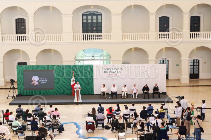 VERACRUZ, VERACRUZ, 21ABRIL2023.- Andrés Manuel López Obrador, Presidente de México, durante la mañanera en el Museo Naval México, ubicado en Veracruz. Los acompañaron Cuitláhuac García, Adán Augusto López, Rosa Icela Rodríguez, Jose Francisco Ojeda Durán, Luis Cresencio Sandoval, y David Córdova Campos.