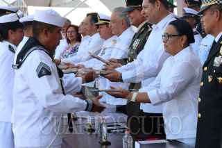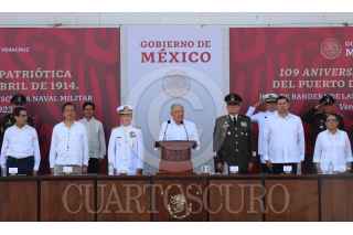 VERACRUZ, VERACRUZ, 21ABRIL2023.- Andrés Manuel López Obrador, presidente de México, presidió el 109 Aniversario de la Defensa Patriótica del Puerto de Veracruz en la Macroplaza del Malecón del Puerto. Lo acompañaron: Alejandro Encinas Rodríguez, subsecretario de Derechos Humanos, Población y Migración y presidente de la Comisión para el Acceso a la Verdad, el Esclarecimiento Histórico y el Impulso a la Justicia de las violaciones graves a los derechos humanos cometidas de 1965 a 1990; Leticia Ramírez Amaya; secretaria de Educación Pública; Rogelio Ramírez de la O, secretario de Hacienda y Crédito Público; Cuitláhuac García Jiménez, gobernador Constitucional del Estado de Veracruz; José Rafael Ojeda, secretario de Marina; Luis Cresencio Sandoval González, secretario de la Defensa Nacional; Alejandro Armenta Mier, presidente de la Mesa Directiva de la Cámara de Senadores y Rosa Icela Rodríguez Velázquez, secretaria de Seguridad y Protección Ciudadana. FOTO: PRESIDENCIA/CUARTOSCURO.COM