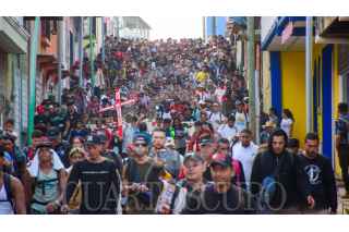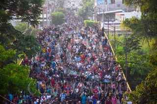 TAPACHULA, CHIAPAS, 23ABRIL2023.- El Viacrusis Migrante partió muy temprano del Parque Bicentenario rumbo a la Ciudad de México, en protesta por la.muerte de 40 migrantes durante un incendio en una estación migratoria del INM en Ciudad Juárez. Un de aproximado de 2500 personas de las distintas nacionalidades salieron, se pudieron observan mujeres, niños y personas, con capacidades diferentes. FOTO: DAMIÁN SÁNCHEZ/CUARTOSCURO.COM