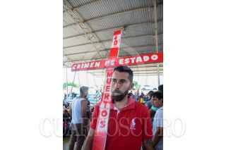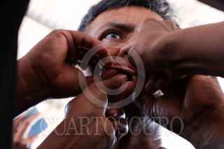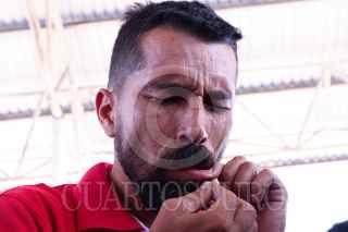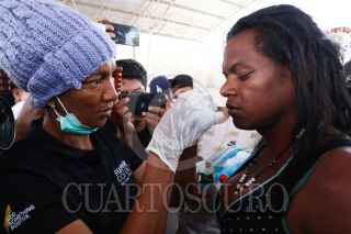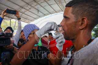 HUIXTLA, CHIAPAS, 25ABRIL2023.- Migrantes de Colombia, Brasil, Cuba, Venezuela, Honduras y el Salvador se cocieron los labios para exigir a las autoridades del Gobierno Federal atención para agilizar los tramites. Roberto Antonio Moreno del salvador dijo llevan tres días caminando exponiendo sus vidas, niños y mujeres, Debora Sofia es de la comunidad trans y también se sumo ha esta protesta. FOTO: DAMIÁN SÁNCHEZ/CUARTOSCURO.COM