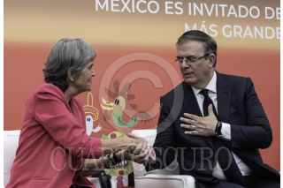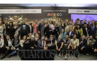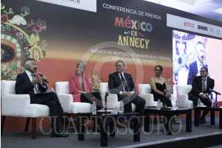 CIUDAD DE MÉXICO, 26ABRIL2023.- Marcelo Ebrard Casaubon, secretario de Relaciones Exteriores; Angelica Lara, directora taller del chucho taller donde se realizó Pinocho de Guillermo del Toro; Jordi Niestra, animador, Francisco Medina director y Mariana Novaro, directora Instituto Mexicano de Cine, durante conferencia de prensa para dar más detalles de México como invitado de honor en el festival ANNECY. FOTO: ANDREA MURCIA /CUARTOSCURO.COM