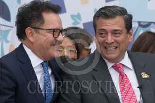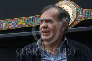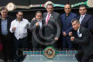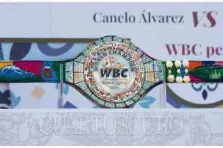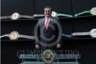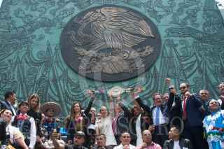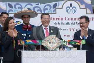 CIUDAD DE MÉXICO, 26ABRIL2023.- Mauricio Sulaimán, presidente de Consejo Mundial de Boxeo; Ignacio Mier, diputado y coordinador de Morena, y Mirza Flores, diputada de MC, encabezaron la develación en el frontispicio de la Cámara de Diputados, el cinturón conmemorativo de la "Batalla del 5 de mayo" que se disputará en la pelea de box WBC entre "Canelo" Álvarez y John Ryder el próximo 6 de mayo en Jalisco. FOTO: MARIO JASSO/CUARTOSCURO.COM