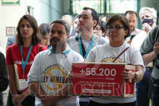 CIUDAD DE MÉXICO, 27ABRIL2023.- La senadora de Morena, Citlali Hernández y el José Narro Céspedes, encabezaron la conferencia de prensa para anunciar que será durante estos últimos días del periodo ordinario de sesiones de la LXV Legislatura. A su vez, recibieron más de 55,200 firmas recolectadas en la plataforma change.org para aprobar lo antes dicha iniciativa. FOTO: GALO CAÑAS/CUARTOSCURO.COM