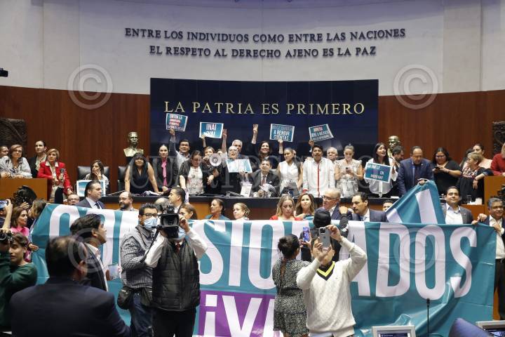 CIUDAD DE MÉXICO, 27ABRIL2023.- Senadores del PAN encabezados por su coordinador Julen Rementería tomaron la tribuna del Senado tras la no elección de un integrante del INAI, los senadores de Morena s enfrascaron en reclamos por esta acción. Los panistas exigen que sean elegidos los tres comisionados que faltan de este organismo para que pueda seguir operando. FOTO: CUARTOSCURO/.COM