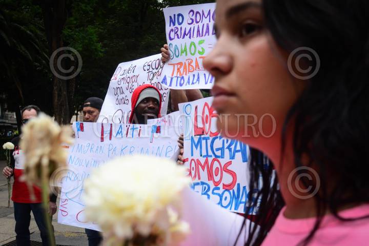 CIUDAD DE MÉXICO, 27ABRIL2023.- Activistas defensores de Derechos Humanos colocaron fotografías en el antimonumento 72 ubicado en Avenida Paseo de la Reforma, como homenaje a los migrantes fallecidos hace un mes en una estancia provisional del Instituto Nacional de Migración (INM) en Ciudad Juarez. FOTO: MARIO JASSO/CUARTOSCURO.COM