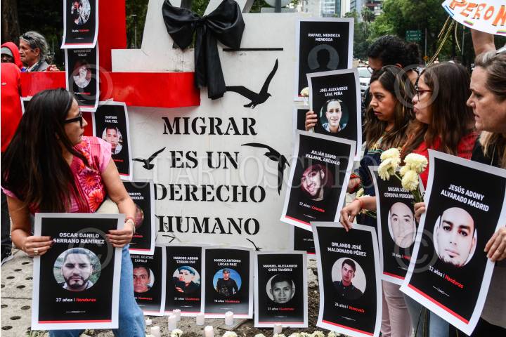 CIUDAD DE MÉXICO, 27ABRIL2023.- Activistas defensores de Derechos Humanos colocaron fotografías en el antimonumento 72 ubicado en Avenida Paseo de la Reforma, como homenaje a los migrantes fallecidos hace un mes en una estancia provisional del Instituto Nacional de Migración (INM) en Ciudad Juarez. FOTO: MARIO JASSO/CUARTOSCURO.COM