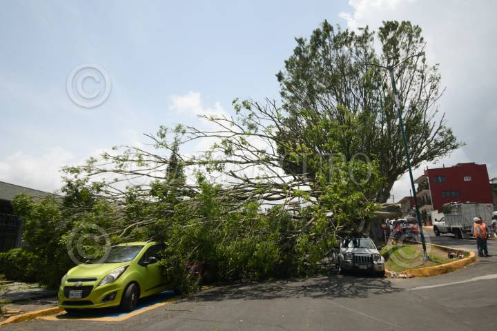 XALAPA, VERACRUZ, 29ABRIL2023.- Las fuertes rachas de viento debido al frente frío 52 derribó un árbol en la calle Encanto, frente al Congreso del Estado de Veracruz. Fueron tres coches a los que el tronco les cayó encima provocando daños cuantiosos. FOTO: YERANIA ROLÓN/CUARTOSCURO.COM