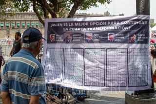 CIUDAD DE MÉXICO, 30ABRIL2023.- Simpatizantes de Morena colocaron una lona con una encuesta con la pregunta ¿Quién es la mejor opción para continuar la Cuarta Transformación", en la misma estaban los rostros de Marcelo Ebrard, Gerardo Fernández Noroña, Adán Augusto, Ricardo Monreal y Claudia Sheinbaum. Los ciudadanos que así lo quisieran podían marcar a su favorito. FOTO: MOISÉS PABLO/CUARTOSCURO.COM