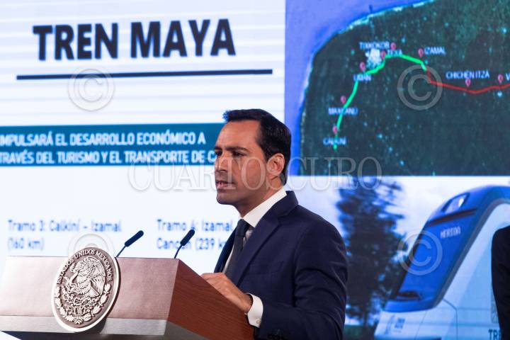 CIUDAD DE MÉXICO, 01MAYO2023.- Andrés Manuel López Obrador, Presidente de México, ofreció su tradicional mañanera en Palacio Nacional, en la cual hablo del Tren Maya, AIFA, Tarjeta Financiera de Bienestar. Lo acompañaron Mauricio Vila Dosal, Gobernador del estado de Yucatán; Ariadna Montiel Reyes, secretaria de Bienestar; Javier May Rodríguez, director general del Fondo Nacional de Fomento al Turismo (Fonatur); Diego Prieto Hernández, director general del Instituto Nacional de Antropología e Historia (INAH); Ricardo Sheffield Padilla, titular de la Procuraduría Federal del Consumidor (Profeco); María del Rocío Mejía Flores, directora general de Financiera para el Bienestar; Manuel Muñoz Cano, director general de Azvindi Ferroviario, y Blas Andrés Núñez Jordán, jefe del Centro Coordinador de Operaciones del Tren Maya. FOTO: MOISÉS PABLO/CUARTOSCURO.COM