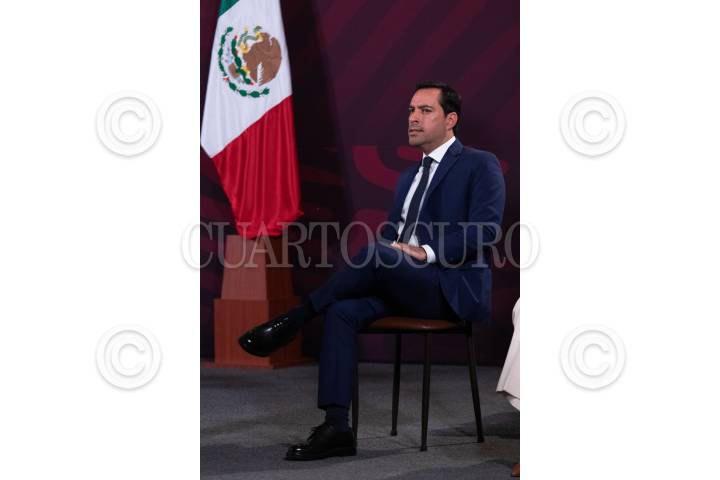CIUDAD DE MÉXICO, 01MAYO2023.- Andrés Manuel López Obrador, Presidente de México, ofreció su tradicional mañanera en Palacio Nacional, en la cual hablo del Tren Maya, AIFA, Tarjeta Financiera de Bienestar. Lo acompañaron Mauricio Vila Dosal, Gobernador del estado de Yucatán; Ariadna Montiel Reyes, secretaria de Bienestar; Javier May Rodríguez, director general del Fondo Nacional de Fomento al Turismo (Fonatur); Diego Prieto Hernández, director general del Instituto Nacional de Antropología e Historia (INAH); Ricardo Sheffield Padilla, titular de la Procuraduría Federal del Consumidor (Profeco); María del Rocío Mejía Flores, directora general de Financiera para el Bienestar; Manuel Muñoz Cano, director general de Azvindi Ferroviario, y Blas Andrés Núñez Jordán, jefe del Centro Coordinador de Operaciones del Tren Maya. FOTO: MOISÉS PABLO/CUARTOSCURO.COM